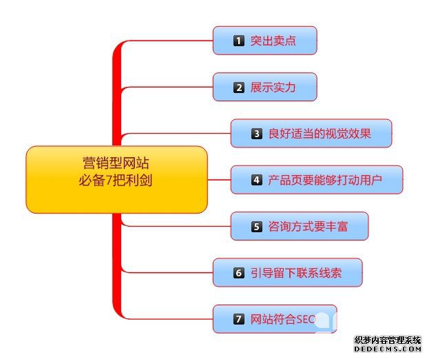 现在很多企业都建设了自己的网站,把产品或服务搬到了互联网上。然而经过一段时间却发现收效甚微,没有出现想中订单飞涨的景象,其原因有很多,但是一个最基本也是最重要的原因就是网站没有做好,现在互联网上90%的企业站都是垃圾,试想一下用户来到你的网站看了半天都没有搞懂这个网站是干嘛的,敢问,这样的网站能带来成交吗?我的建议是企业做网络营销首先要把网站做好,如果网站没有做好就先不要去推广。决定一个企业网站转化率高低的我总结了7把必备利剑,把这7把利剑用好好就是一个标准的营销型网站。先上图